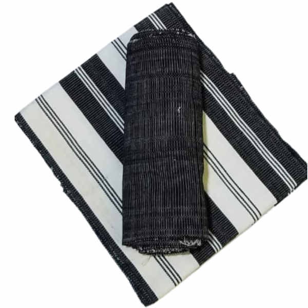 Le pagne est vendu en bandes telles que sorties du métier à tisser. Un pagne assemblé mesure environ 180 cm x 120 m
