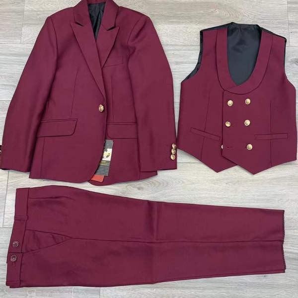 Le costume enfant bordeaux au tissus mat est composé d'une veste avec un bouton à l’avant, d'un col châle en satin noir, bas de manches avec quatre boutonnières satinées, une poche-poitrine passepoilée décorative, deux poches latérales passepoilées avec liseré en satin, épaulettes intérieures et deux fentes au dos.