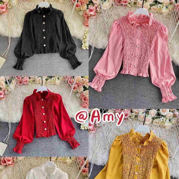 Présentation produit : Haut chemisier imprimé léopard néon à col montant et à volants pour femmes.