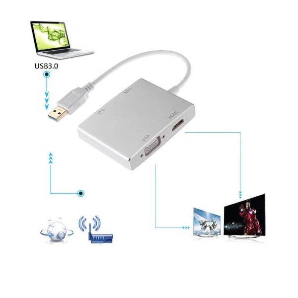 4 en-1 USB 3.0 vers 1080p HDMI/VGA/DVI/RJ45