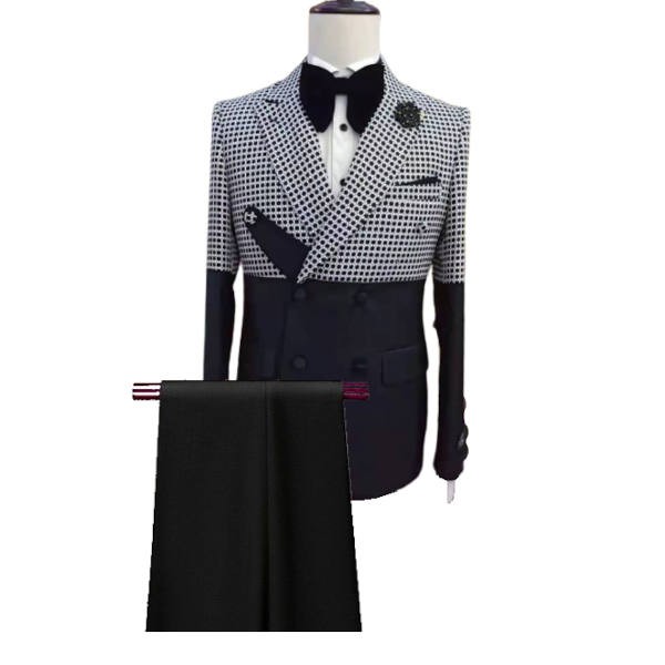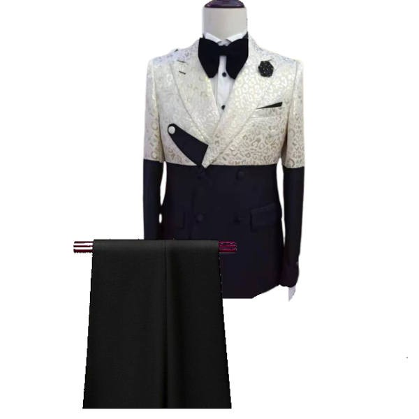Le costume bicolore Fashuné est un costume croisé à six boutons avec de larges revers en pointe. Il est livré avec une ceinture blanche en option qui recouvre la cravate et des boutons sur le costume.
